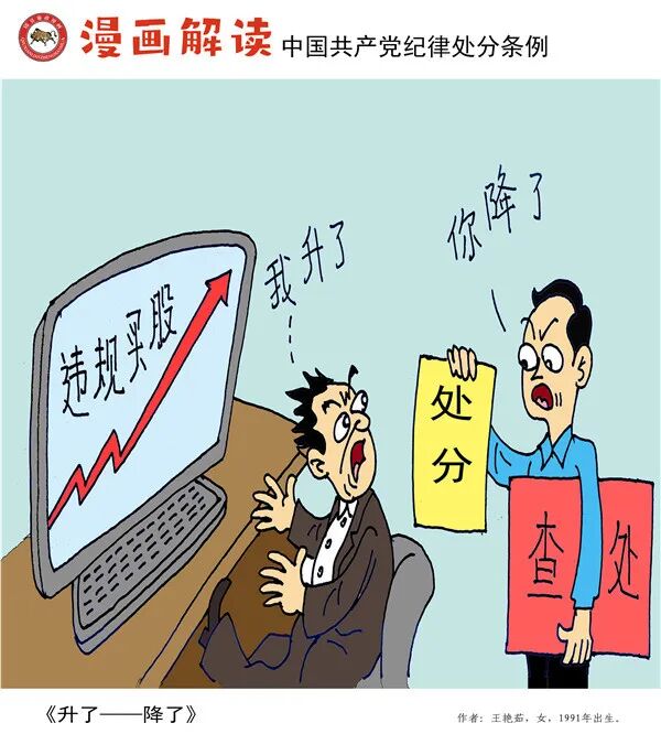 漫说党纪 漫画解读《中国共产党纪律处分条例》 违反有关规定买卖股票或者进行其他证券投资的,情节较轻的,给予警告或者严重警告处分;情节较重的,给予撤销党内职务或者留党察看处分;情节严重的,给予开除党籍处分。 违反有关规定从事有偿中介活动的,情节较轻的,给予警告或者严重警告处分;情节较重的,给予撤销党内职务或者留党察看处分;情节严重的,给予开除党籍处分。